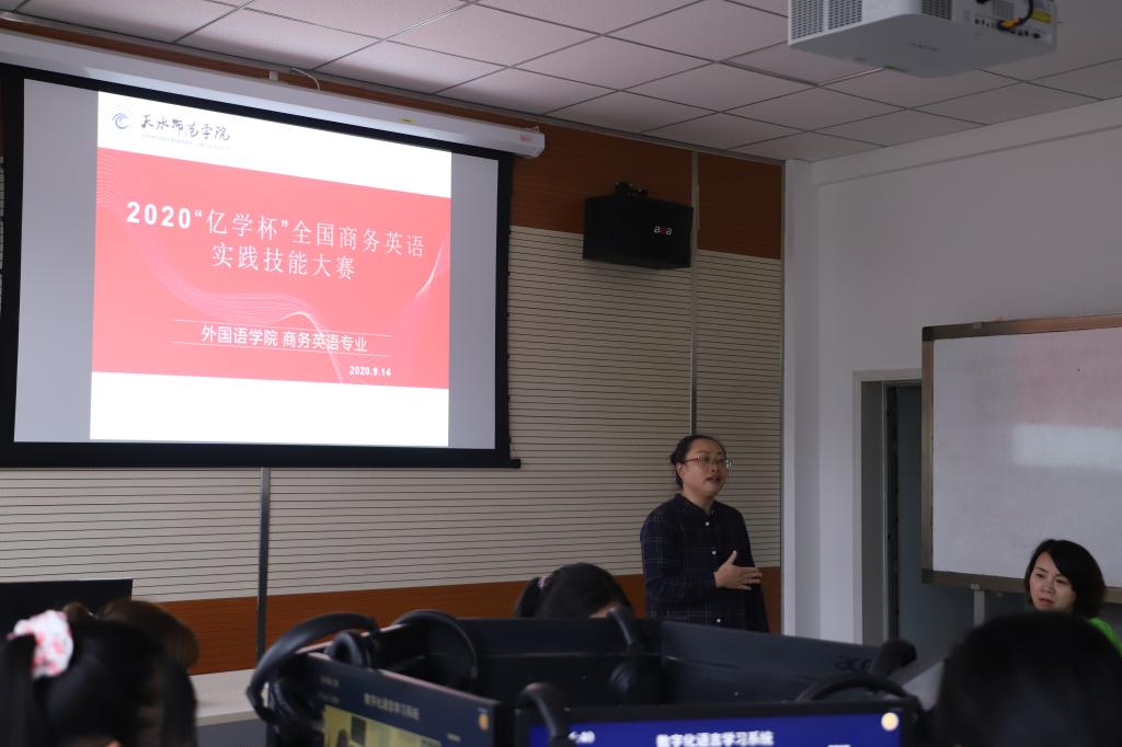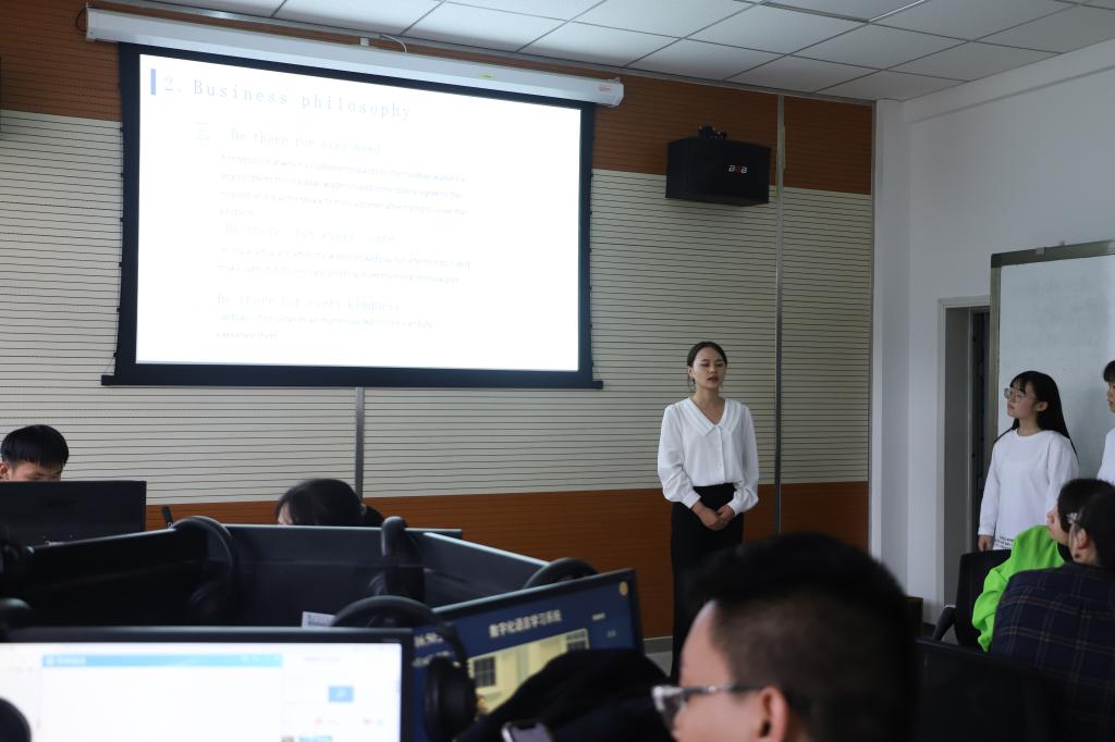 为加快培养具有国际视野、通晓国际规则、能够参与国际事务和竞争的国际化人才,巩固高校大学英语和英语专业教育教学改革成果,展现新时代高校学生的中国情怀和国际视野,网投十大信誉可靠平台商务英语专业于9月14日举办了2020“亿学杯”全国商务英语实践技能大赛的选拔赛。副院长马金海,商务英语系主任,任课教师,以及2019级商务英语一班的全体同学观摩了本次比赛。