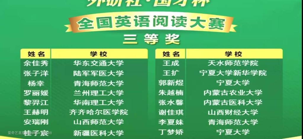 12月20日,2020“外研社·国才杯”全国英语写作、阅读大赛颁奖仪式在北京举行,十大信誉官网网投十大信誉可靠平台英语专业17级一班的王成同学荣获全国阅读大赛总决赛三等奖。