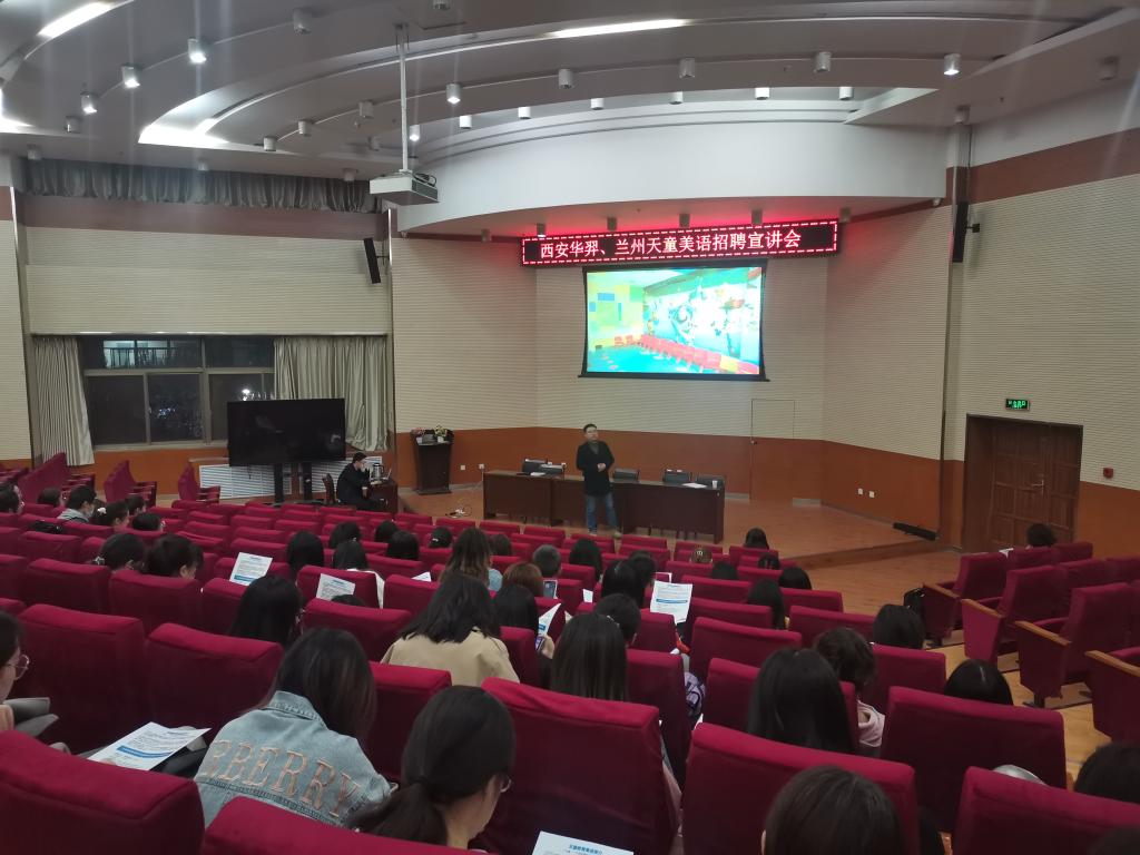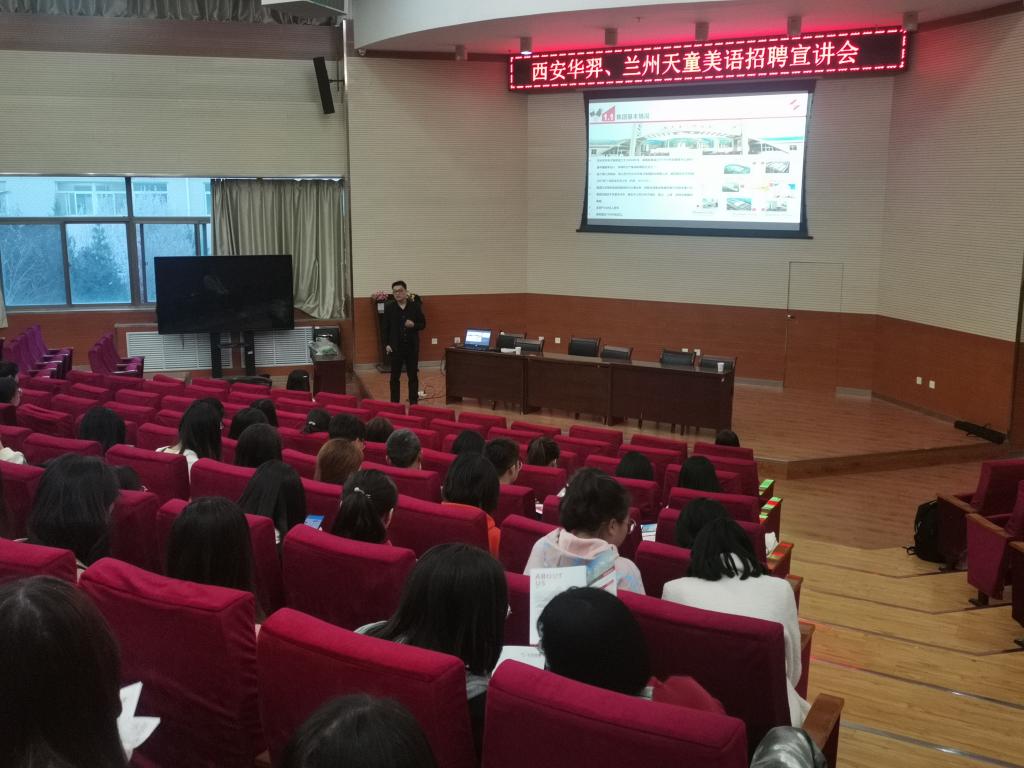 随后,兰州天童美语学校负责人以流利的英语开场,进行了精彩的宣讲,具体从学校基本情况、企业文化、招聘岗位、薪酬福利方面做了详细讲解。天童美语学校在全国成立了八十余家分校,集团自成立以来,一直秉承着“天童专注儿童英语所以更专业”这一信念,有着独特的教学模式,科学的教学方法和优秀的教学团队。最后,该校负责人给毕业生们提供了几点就业建议,指出无论在什么岗位,都要对自己的工作保持热情和动力,投入多少就会回报多少,关注自身发展和提升,才能在激烈的竞争中脱颖而出,成就一番事业。