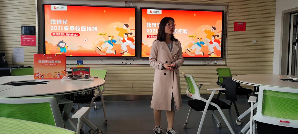 宣讲开始,企业负责人首先就公司概况为同学们做了详细讲解:猿辅导在线教育成立于2012年,是全球教育科技领域估值最高的独角兽公司,也是目前国内网课用户规模最大的在线教育集团。公司旗下有猿辅导、斑马AI课、小猿搜题、校园口算、猿题库等多款在线教育产品。目前全国员工规模超50000人,总部位于北京,同时在西安、武汉、郑州、长沙等各大城市设分公司。随后负责人为同学们介绍了招聘岗位、薪资待遇以及晋升机制。包括一年两次的晋升评审,只要有足够的能力,新入职的老师们都能通过竞聘走向更高的岗位。