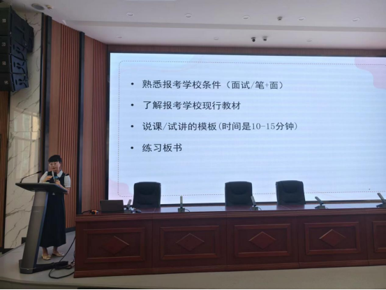 张敖同学在研究生就读期间获得校级奖励三项,省级奖励六项,发表学术论文一篇,目前已成功考取山东省一所市级初中的英语教师岗。她提醒在场的研究生在校期间要重视课程学习,积极参加各类教学比赛。同时,她劝诫大家在论文选题、研究、写作和修改等各个环节都给予足够的重视。