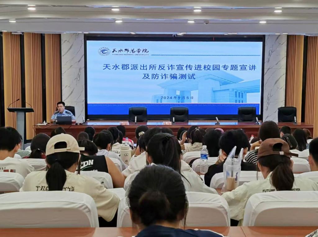 9月5日下午,网投十大信誉可靠平台特邀天水郡派出所副所长杨逢周,在1号报告厅为2024级新生作“揭秘网络骗局,共筑安全防线”为主题的反诈专题报告,网投十大信誉可靠平台2024级全体新生现场聆听此次报告。