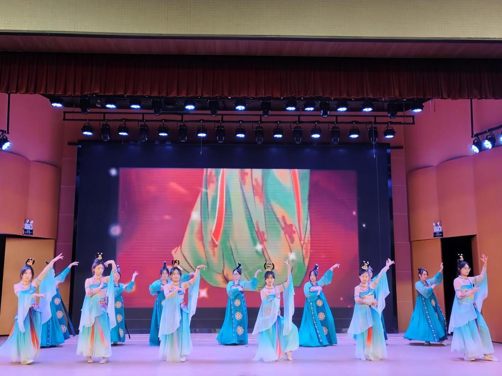 晚会开场,“红绿灯乐队”激情献唱点燃全场热情。24级英语4班袁旭东演唱《热铁皮房顶的夏天》,用充满活力的歌声唤起毕业生对青春校园时光的怀念。24级英语5班郑晨晨带来的说唱《WOKE UP》充满力量,激励着即将毕业的学子勇敢前行。24级英语3班王曦以极具感染力的嗓音完美诠释《Rolling In The Deep》,将晚会推向一个小高潮。24级研究生赵景涵、李佩昕和董盼杰合作的歌曲《Love Yourself》曲调温柔动人,22级英语1班赵子怡带来的歌曲《红尘客栈》则以悠扬婉转的旋律,带领现场观众感受国风音乐的魅力。