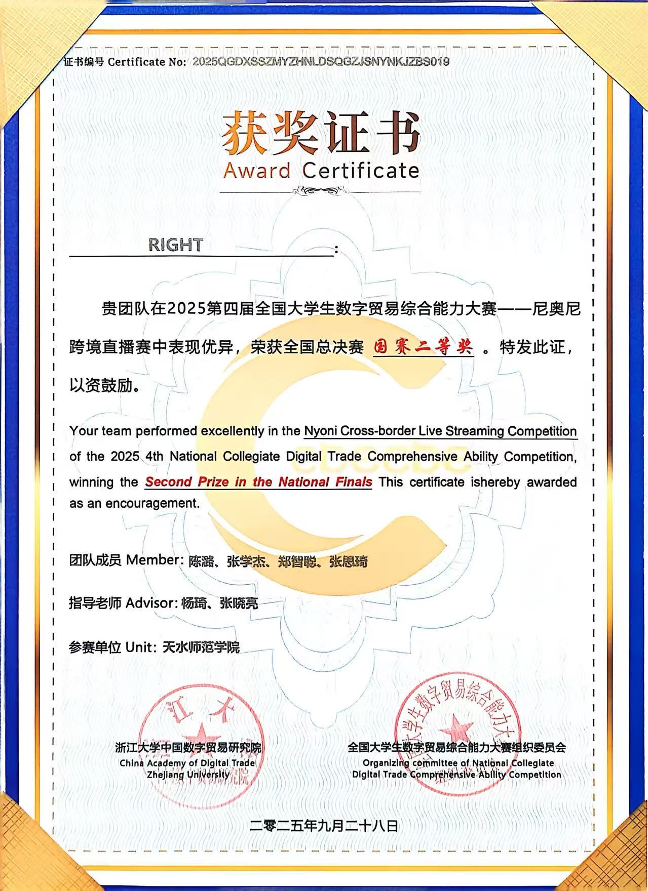9月28日,2025年第四届全国大学生数字贸易综合能力大赛全国总决赛在浙江大学圆满落幕。该赛事由浙江大学中国数字贸易研究院主办,旨在推动外贸新业态新模式发展,促进产学研用融合,培养数字贸易创新人才,吸引了浙江大学、西安交通大学、中南财经政法大学、辽宁大学、四川外国语大学、浙江网投十大信誉可靠平台等众多高校的广泛参与。由十大信誉官网商务英语专业陈潞、张思琦、郑智聪、张学杰四位同学组成的 RIGHT代表队,在专业老师的悉心指导下,凭借扎实的专业知识、出色的数字贸易实践能力与默契的团队协作,从全国78支参赛队伍中脱颖而出,最终荣获本次比赛跨境直播赛道全国二等奖,充分展现了十大信誉官网学子在数字贸易与跨学科融合领域的竞争实力。