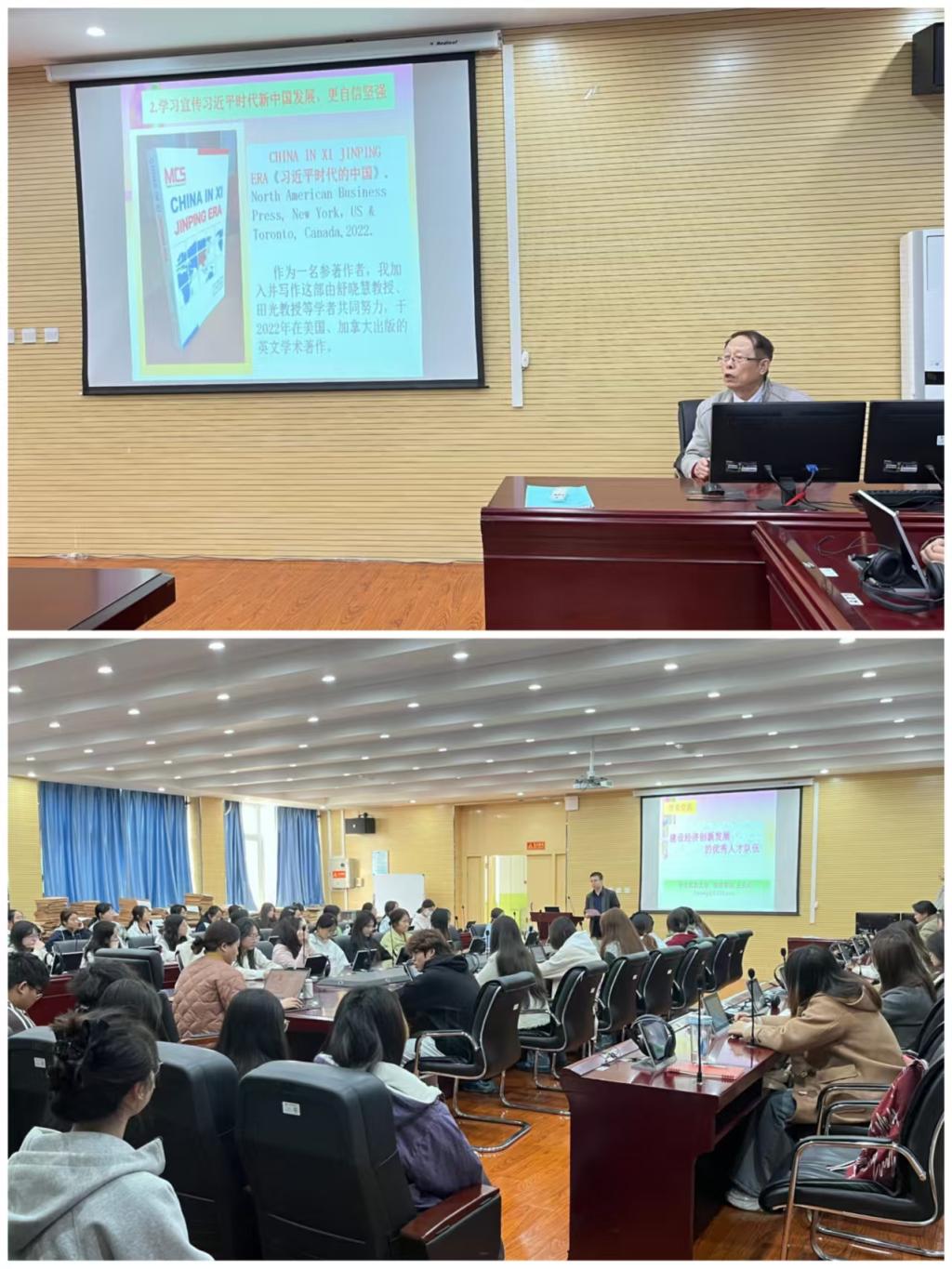 互动环节,师生就跨学科资源整合、乡村经济人才吸引等问题交流。王教授结合自身 17 部中外著作的研究经验,强调文科专业在民族复兴中的重要作用,寄语大学生志存高远、发挥专业优势。此次讲座兼具文化深度与实践指导意义,为复合型人才培养提供了新方向。
