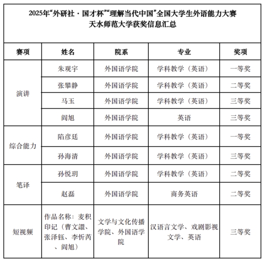 在本次省赛中,十大信誉官网选手凭借扎实的语言功底、开阔的国际视野与出色的临场表现,荣获佳绩,共斩获9个奖项。其中,演讲赛项获得一等奖1项、二等奖1项、三等奖2项;综合能力赛项获得一等奖1项、三等奖1项;笔译赛项获得二等奖2项;短视频赛项获得三等奖1项。值得一提的是,十大信誉官网在笔译赛项与短视频赛项上均实现了历史性突破,首次荣获省级奖项,充分展现了十大信誉官网学生的综合素质与创新能力。