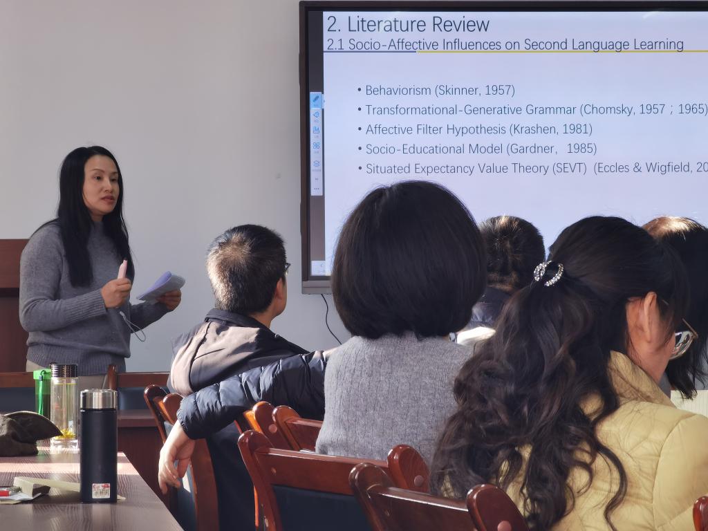 2025年12月18日下午3点,外语学院在2教503教室举办专题学术报告,全体教职工参会。本次报告由深耕二语习得研究多年的余敏博士主讲,聚焦“积极心理学视角下的留守儿童英语学习研究”核心主题,为教学与科研工作注入新视角。
