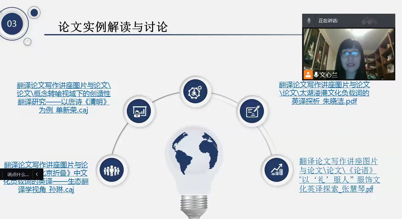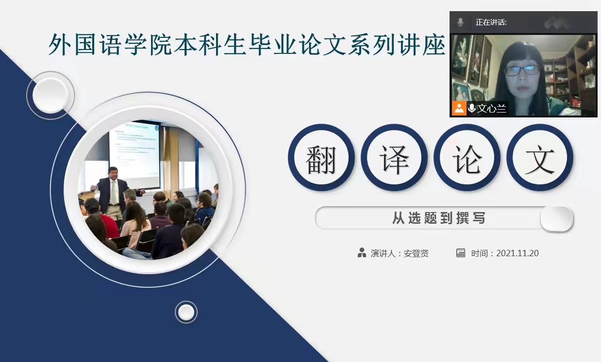 2021年11月20日下午,安登贤老师通过腾讯会议平台为英语专业本科生作了有关翻译类论文选题与撰写的讲授。安老师从选题范围与注意事项、论文撰写过程注意事项、实例解读与讨论三个部分进行了详细具体的讲授。
