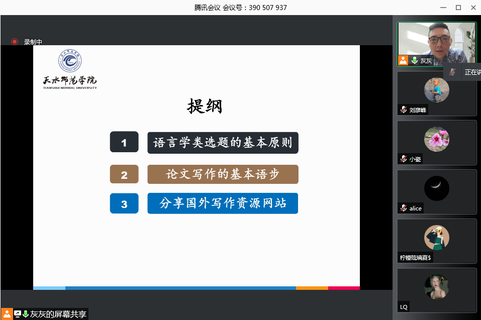 2021年11月21日晚八点,张晖老师通过腾讯会议平台为英语专业本科生作了题为《语言学类论文的选题与写作规范》的报告。张晖老师的讲座旨在向同学们介绍语言学类论文选题的基本原则和英语学术论文写作的基本规范。