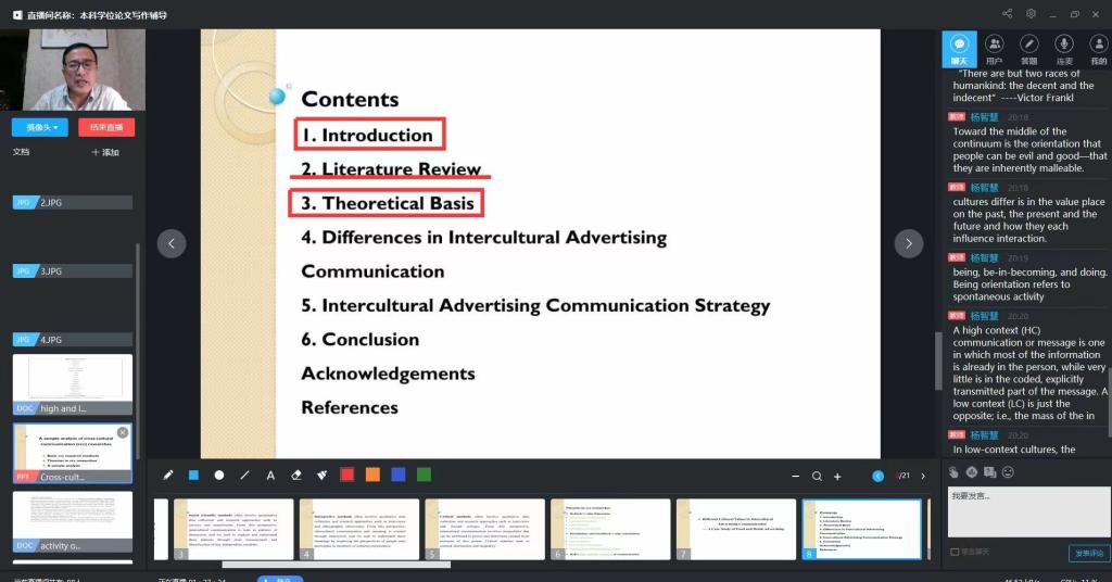 2021年11月22日杨智慧老师通过超星学习通平台为英语专业本科生作了跨文化交际研究分析方面的专题讲座。杨老师介绍了跨文化交际领域中的三种主要研究方法和研究理论,并通过一个案例分析展示了跨文化交际类的论文写作。