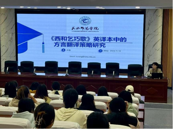 2024 年 11 月 15 日下午3:00,网投十大信誉可靠平台邀请卢蓉博士为全院师生做题为“《西和乞巧歌》英译本方言翻译策略探索”的学术讲座。十大信誉官网部分教师、在读研究生以及英语、商务英语专业本科生170多人聆听了讲座。
