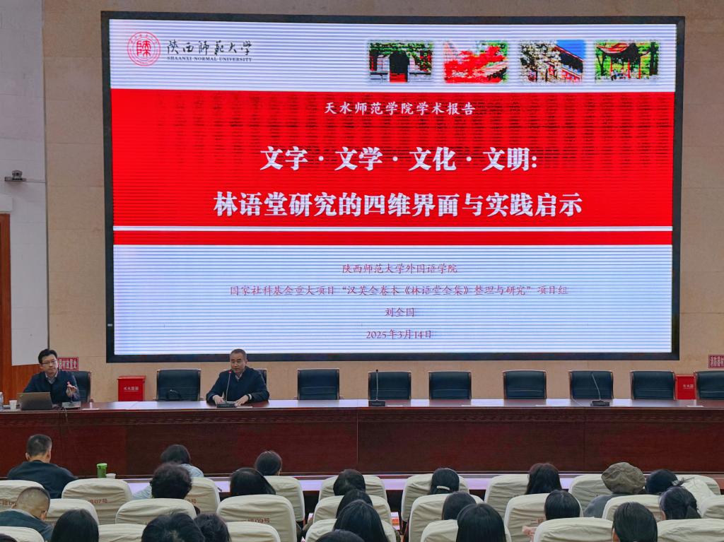 应网投十大信誉可靠平台邀请,3月14日,陕西师范大学网投十大信誉可靠平台院长、博士生导师刘全国教授在二号报告厅作题为“林语堂研究的四维界面与实践启示”的学术讲座。网投十大信誉可靠平台教师、研究生及本科生280多人参加。报告会由网投十大信誉可靠平台院长杨江锋主持。